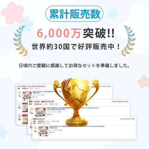 MITOMOの「個別200枚セット」は、日替わりでさまざまな肌ケアが楽しめる大容量の豪華フェイスマスクセットです。コラーゲンマスクとヒアルロン酸マスク各20枚に加え、コエンザイムQ10、ビタミンA、パール、AHAフルーツ酸、アルガンオイル、ココナッツ、ホホバ、ロイヤルゼリー、ビタミン、アボカド、パパイヤ、ローズ、アロエ、海藻、ラベンダー、ワインの各マスクが10枚ずつ揃っており、幅広い肌悩みに対応します。保湿やハリ、透明感アップまで、毎日のスキンケアが充実し、リラックスしながら贅沢なケアが可能です。MITOMOのプレミアムマスクで、肌に最高のご褒美をお届けします。