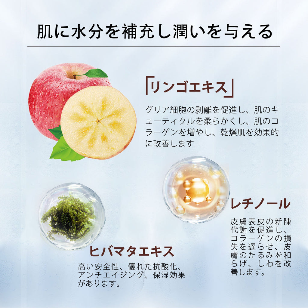 水、グリセリン、BG、DPG、フェノキシエタノール、クロルフェネシン、アラントイン、カルボマー、パンテノール、PEG-60水添ヒマシ油、TEA、EDTA-2Na、ヒアルロン酸Na、ボスウェリアセラタ樹脂エキス、炭、リンゴエキス、ヒバマタエキス、レチノール、アロエベラ葉エキス、香料、ポリアクリル酸Na