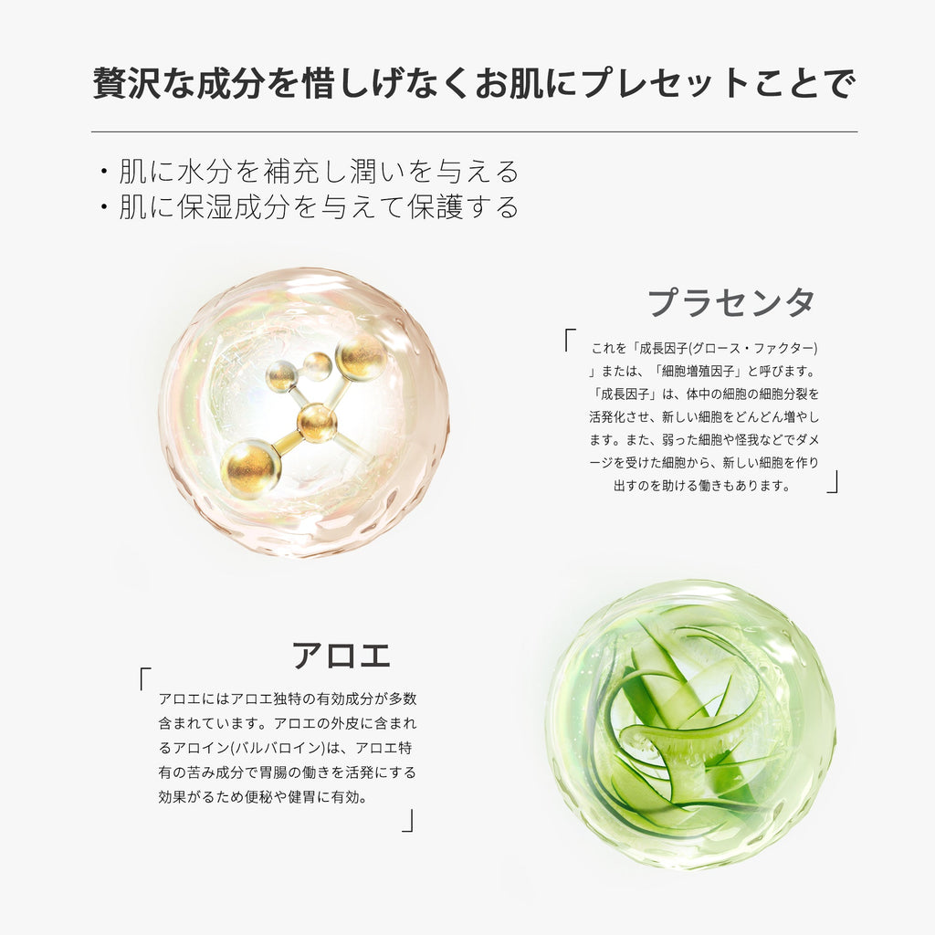水、グリセリン、BG、DPG、フェノキシエタノール、クロルフェネシン、アラントイン、カルボマー、パンテノール、PEG-60水添ヒマシ油、TEA、EDTA-2Na、ヒアルロン酸Na、ボスウェリアセラタ樹脂エキス、プラセンタエキス、ユズ果実エキス、ヒパマタエキス、コロイド性白金、アスコルビルエチル、アロエベラ葉エキス、香料、ポリアクリル酸Na