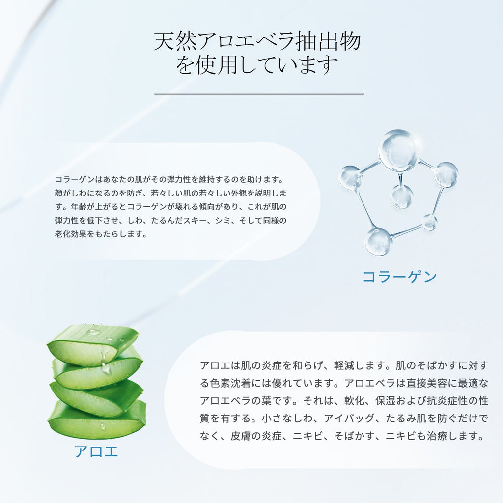 水,グリセリン,BG,DPG,フェノキシエタノール,クロルフェネシン,アラントイン,カルボマー,パンテノール,PEG-60水添ヒマシ油,TEA,加水分解コラーゲン,EDTA-2Na,ボスウェリアセラタガム,香料,アロエベラ葉エキス,ヒアルロン酸Na,ポリアクリル酸Na