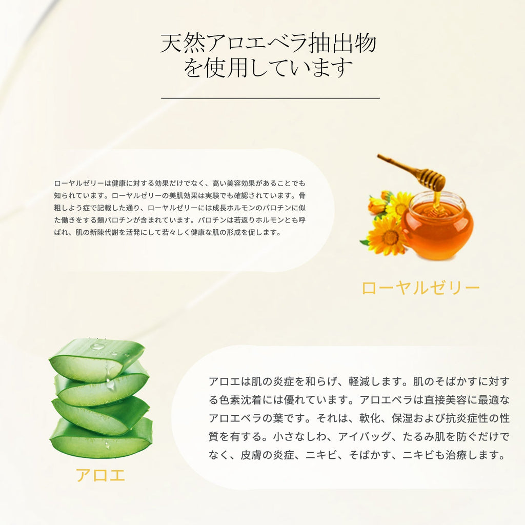 ローヤルゼリー抽出物を含み、肌のターンオーバーを改善し、保湿力を高め、ハリを保つ効果が期待できます。