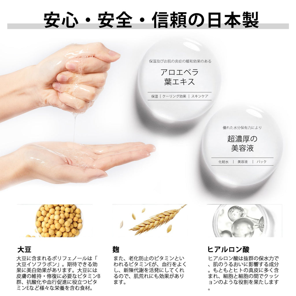 水、グリセリン、BG、DPG、フェノキシエタノール、クロルフェネシン、アラントイン、カルボマー、パンテノール、PEG-60水添ヒマシ油、TEA、香料、ダイズ粉、コメ発酵液、コメエキス、EDTAー2Na、ボスウェリアセラタ樹脂エキス、アロエベラ葉エキス、ヒアルロン酸Na、ポリアクリル酸Na、1,2-ヘキサンジオール
