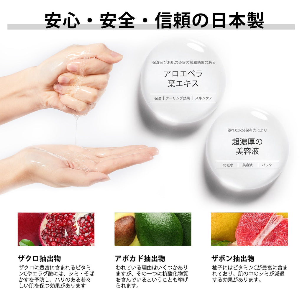 水、グリセリン、BG、DPG、フェノキシエタノール、クロルフェネシン、アラントイン、カルボマー、パンテノール、PEG-60水添ヒマシ油、TEA、香料、アボカドエキス、ザクロ果実エキス、ユズ果実水、BDTA-2Na、ボスウェリアセラタ樹脂エキス、アロエペラ葉エキス、ヒアルロン酸Na、ポリアクリル酸Na