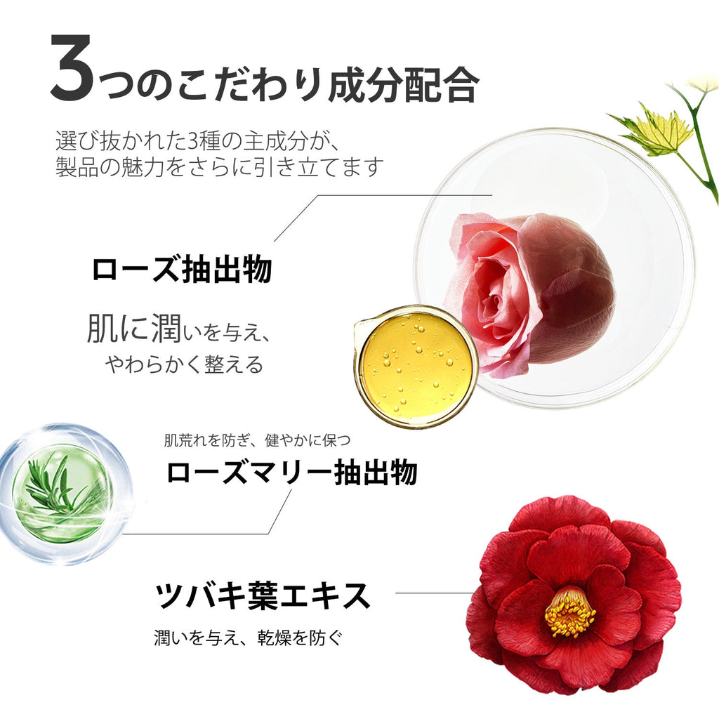 水、グリセリン、BG、DPG、フェノキシエタノール、クロルフェネシン、アラントイン、カルボマー、パンテノール、PEG-60水添ヒマシ油xTEA、香料、パラエキス、ローズマリー葉エキス、ツバキ葉エキス、EDTA-2Na、ボスウェリアセラタ樹脂エキス、ラベンダーエキス、アロエベラ葉エキス、ヒアルロン酸Na、ポリアクリル酸Na