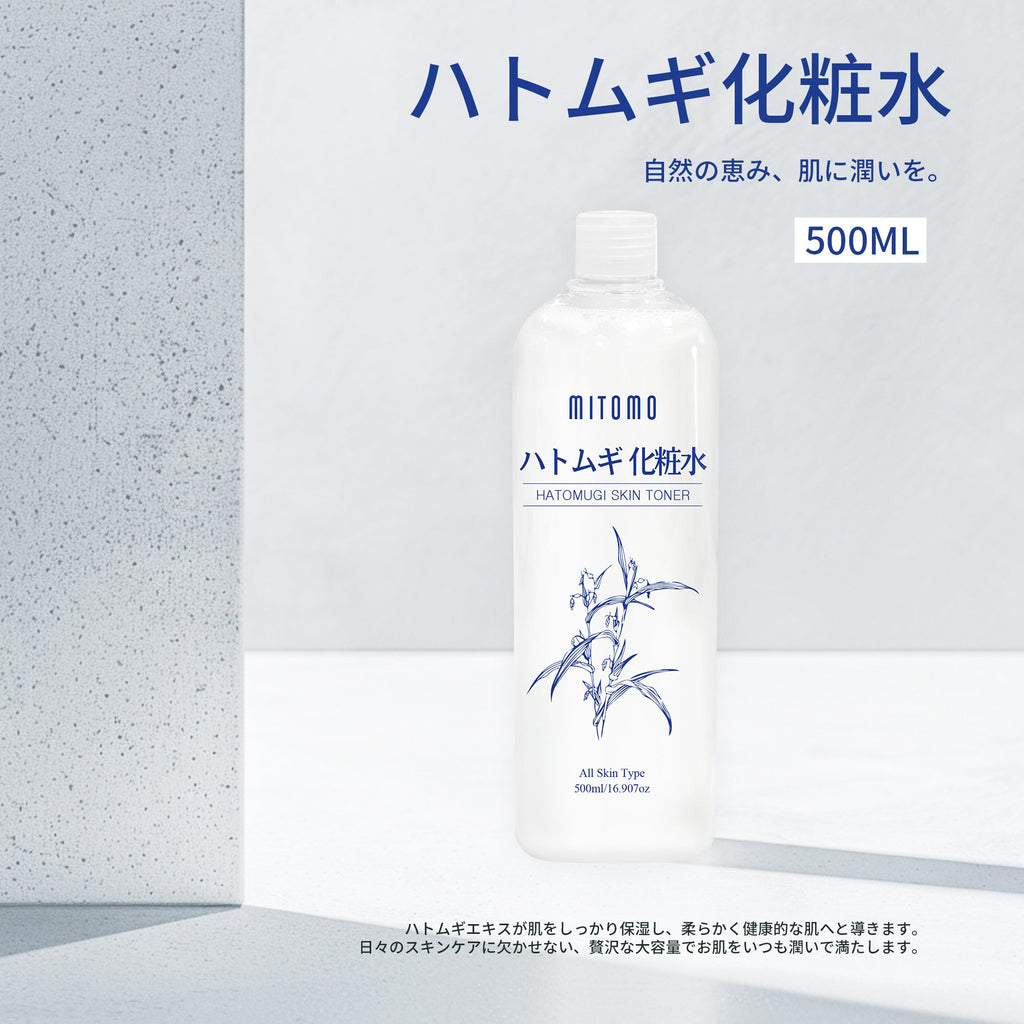 "自然の恵み、肌に潤いを。ハトムギ化粧水500ML。ハトムギエキスが肌をしっかり保湿し、柔らかく健康的な肌へと導きます。日々のスキンケアに欠かせない、贅沢な大容量でお肌をいつも潤いで満たします。