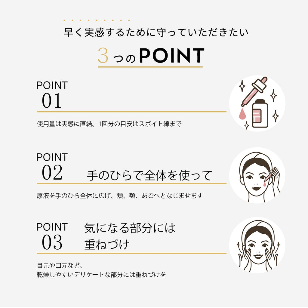 【使用方法】洗顔後、化粧水などでお肌を整えた後適量を手に取り、お顔全体にセラムをやさしくなじませてください。