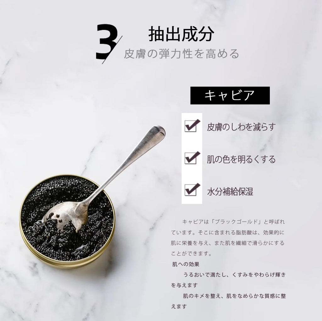 キャビアは「ブラックゴールド」と呼ばれています。そこに含まれる脂肪酸は、効果的に肌に栄養を与え、また肌を繊細で滑らかにすることができます。キャビアの効能と機能を以下に示します。