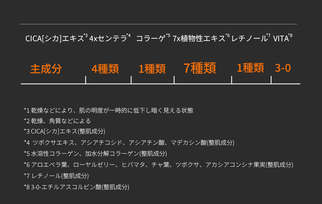 水、グリセリン、BG、DPG、ツボクサエキス、カンジダボンビコラ/(グルコース/ナタネ油脂肪酸メチル)発酵物、ヒマワリ種子油、エトキシジグリコール、アシアチコシド、アシアチン酸、マデカシン酸、キサンタンガム、1,2-ヘキサンジオール、アカシアコンシナ果実エキス、加水分解コラーゲン、PG、ベタイン、3-O-エチルアスコルビン酸、レチノール、フェノキシエタノール、クロルフェネシン、アラントイン、カルボマー、パンテノール、PEG-60水添ヒマシ油、TEA、香料、アボカドエキス、ザクロ果実エキス、ユズ果実エキス、EDTA-2Na、ボスウェリアセラタ樹脂エキス、アロエベラ葉エキス、ヒアルロン酸Na、ポリアクリル酸Na