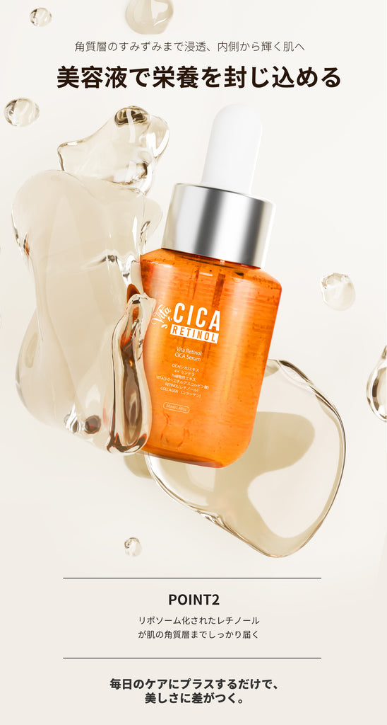 レチノールとCICAが肌を整え、エイジングケアと肌荒れ予防の両方を実現。敏感肌にも優しく、日々のケアに最適。 -