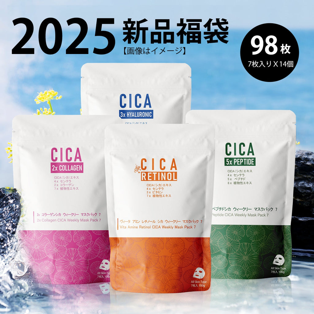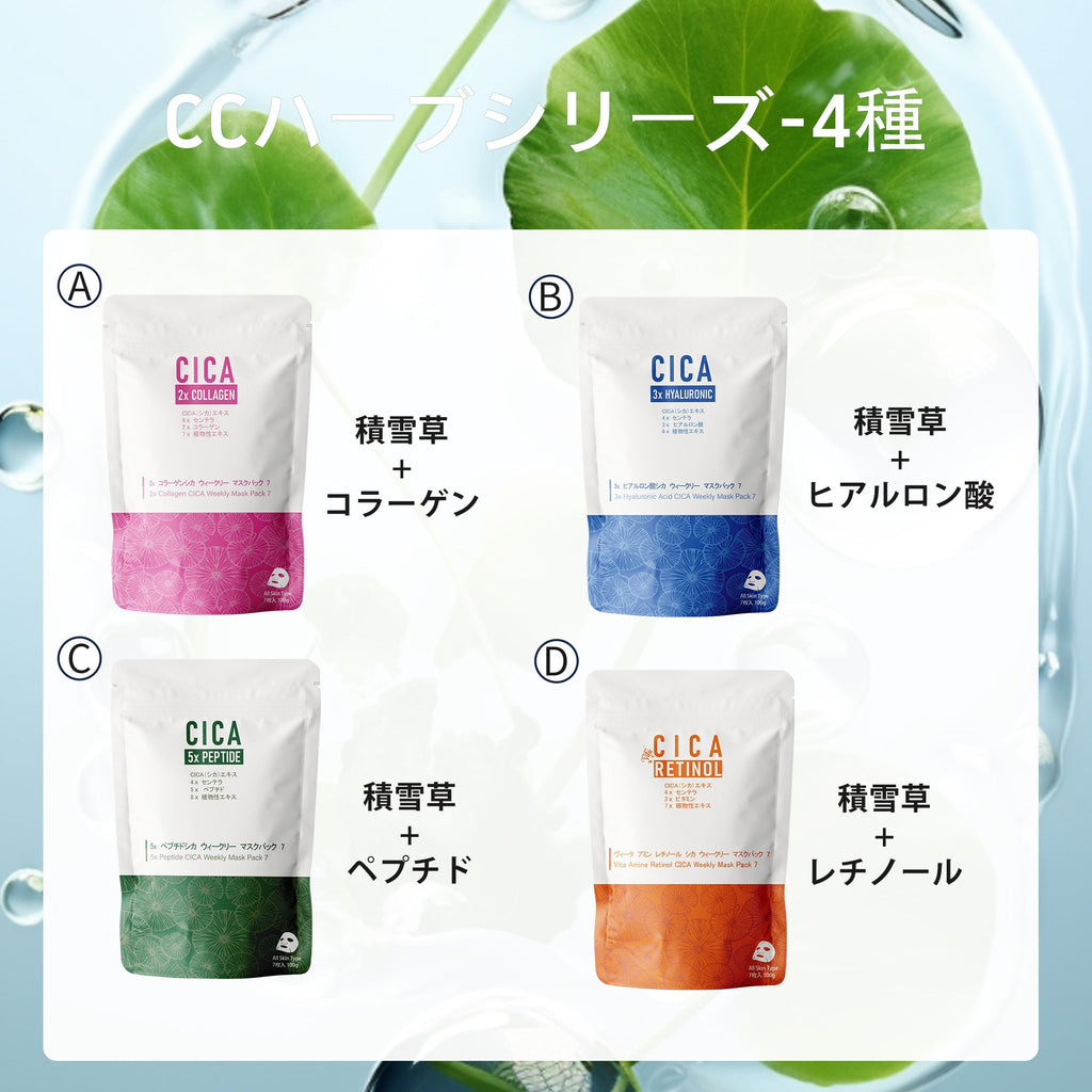 全4種類(A:積雪草+コラーゲン、B:積雪草+ヒアルロン酸、C:積雪草+ペプチド、D:積雪草+レチノール)の中からランダムに 14袋(合計98枚) をお届けします。