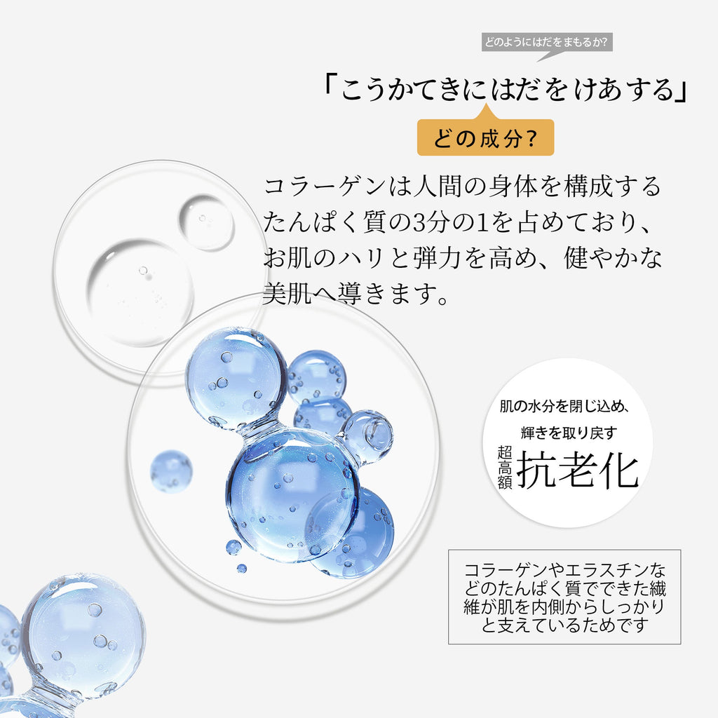 「コラーゲン」は、その形態によって保湿のメカニズムは異なりますが、いずれも、角層のうるおいをしっかり保持し、みずみずしさやハリ感を与えてくれる頼もしい成分なのです。