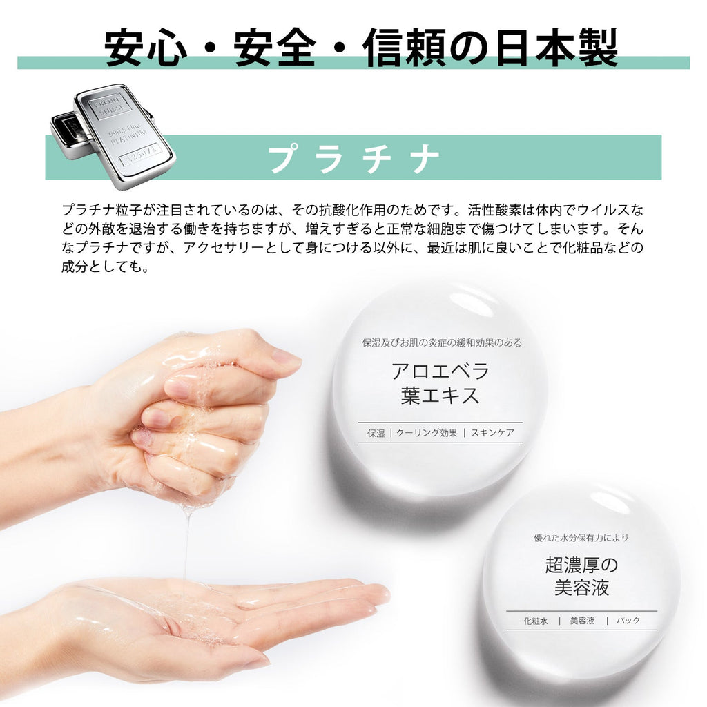 自ら電位を帯び るプラチナコロイドは、肌の電位バランスを整え、 バリア機能を回復させる力を持っています。 また 電子を供給することで皮膚細胞が正常化される ため、日焼けの後のお手入れや、乾燥によるダメ ージなどからも肌を守ります。