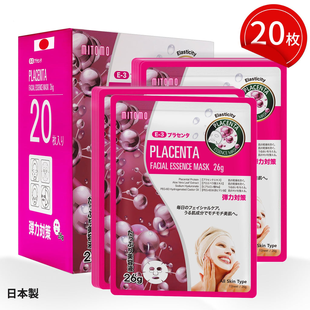 MITOMO <日本製>プラセンタ弾性フェイシャルエッセンスマスク/20枚- 肌を活性化し、弾力性を与えるナチュラルプラセンタ配合【MTSS00516-E-3x002】