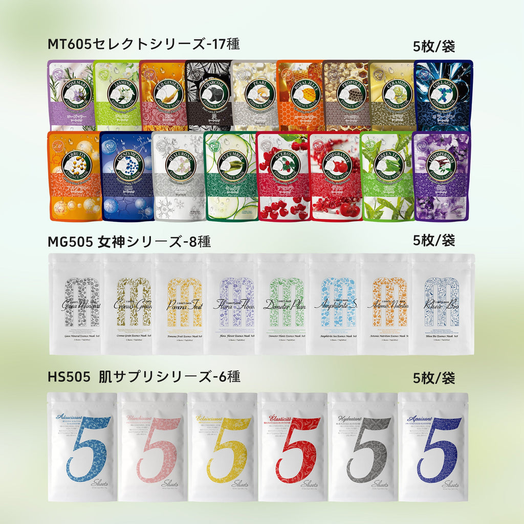 MITOMO が贈る超お得セット!合計 50枚(1袋5枚 × 合計10袋)、MT605 系列 17 種 + MG505 系列 8 種 + HS505 系列 6 種、全31種類のフェイスマスクがランダムに届く豪華バラエティパックです。毎日のお手入れから旅行先まで、手軽に日本製の贅沢なマスクを楽しめます。日本国内で製造されており、品質と安心感にこだわった一品です。