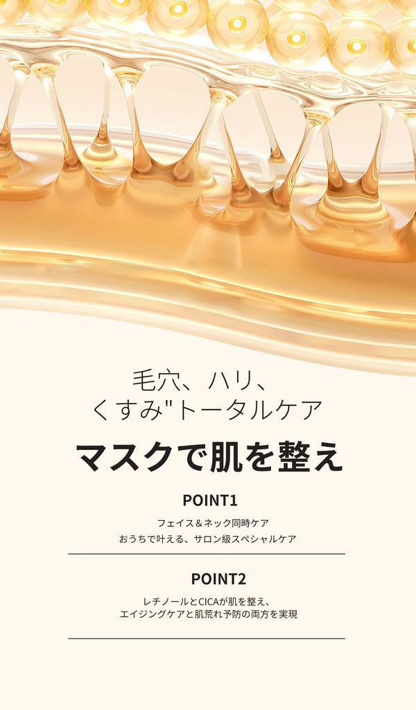 レチノールとCICAを贅沢に配合したマスクと美容液が、しっかりと肌に浸透し、乾燥小ジワやたるみをケア。
