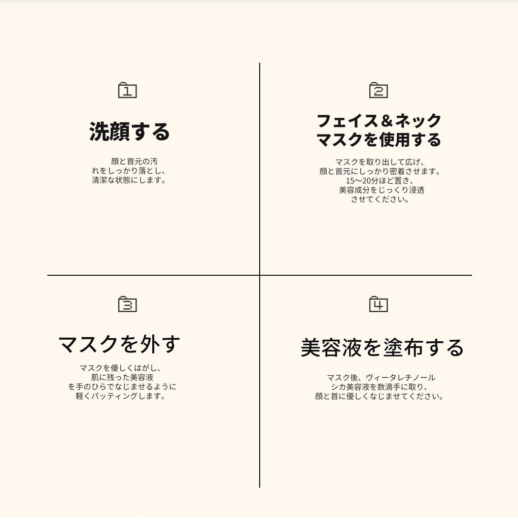 マスク後、ヴィータレチノールシカ美容液を数滴手に取り、顔と首に優しくなじませてください。